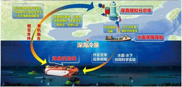 冷泉装置包含“海底实验室分总体”“保真模拟分总体”“保障支撑分总体”三部分,采用“样地实验+陆地模拟,海陆协同、时空互换”的设计思想,计划用5年时间,建设面向冷泉生态系统的深海载人驻守型海底实验室与陆基保真模拟设施相融合的国际领先研究装置,支撑冷泉生态系统发育、化能合成生物演替和甲烷物态演化及其环境效应研究。